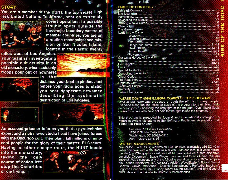 The inside front cover shows the story and includes some pictures not used in the game. I assume they were originally intended to use the cinematic engine that was written for the game (but only used a little for the ending, and not to its potential). On page one, the table of contents and system requirements. BTW, those little white boxes you see throughout the manual are mini-flipbooks that show monks exploding.