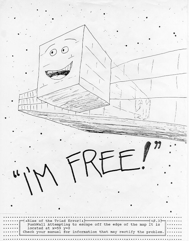 ... and the game would give some coordinate. The first time I saw this message, I busted a gut laughing at this. I did it in Tom's office, and he drew up this picture of a pushwall with a face on it smiling escaping from a wall. It looked very silly and we all had a big laugh out of it. To be honest, I cannot remember who actually said "I'm Free" for the first time (I think it was Joe Selinske, though). Anyway, I ran over to the flatbed scanner, scanned Tom's picture, and gave it to Mark Dochtermann who put it in the game. When that error occurred, the game then displayed Tom's silly graphic before the genuine game error screen was displayed. Somewhere along the line, "I'm Free" got added to the error message as well. This is just another example of the silliness that went on behind the scenes."