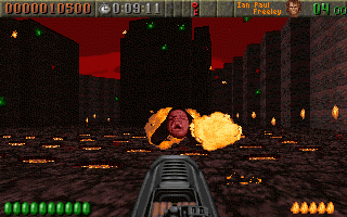 "Those funny retard sounds were sort of an imitation of Romero going into God and no-clip in Wolfenstein, and walking around in slow motion like some unstoppable ghost demon or something, shooting everything in the level." Tom Hall explains. "It was so hilarious at the time, that's what I had 'god' sound like." |
